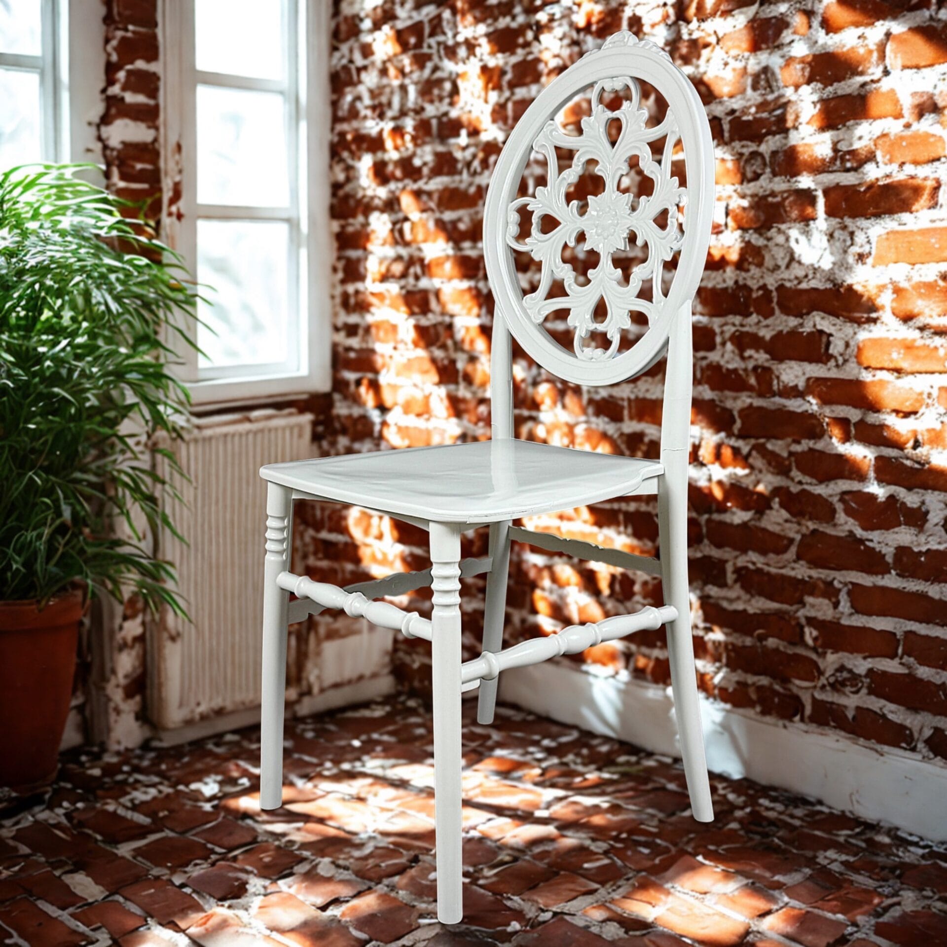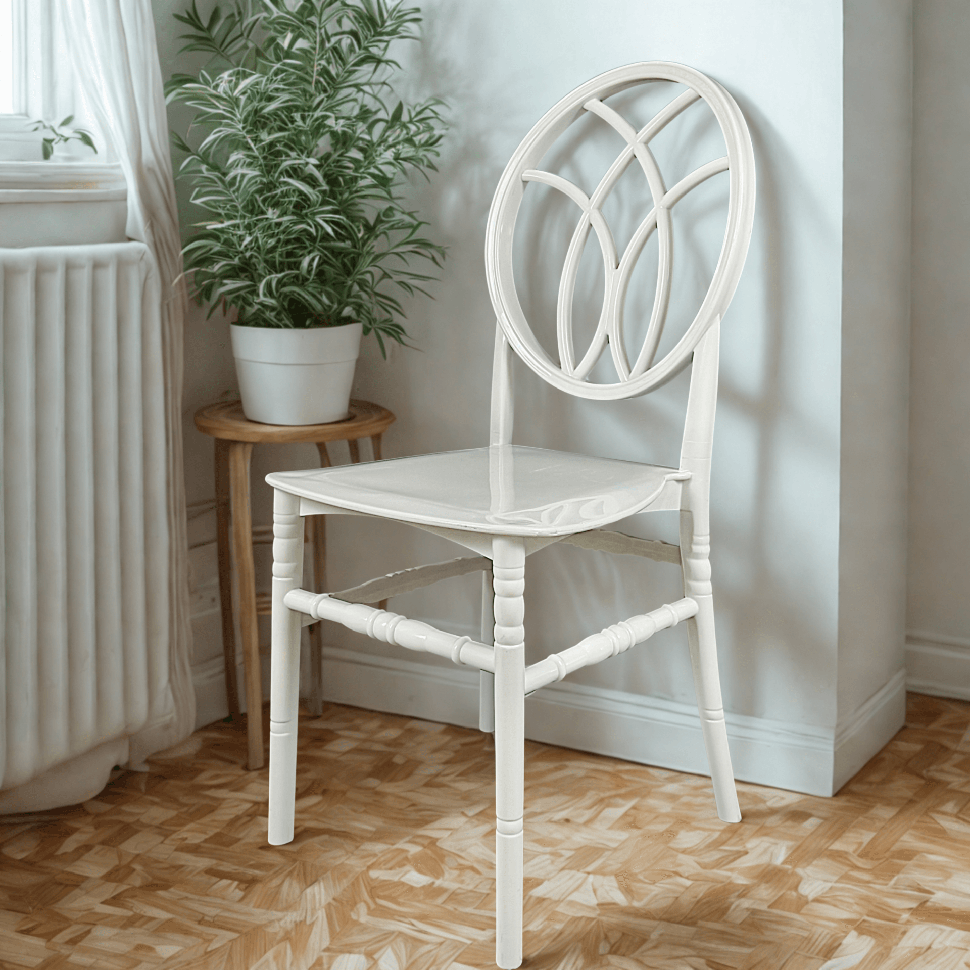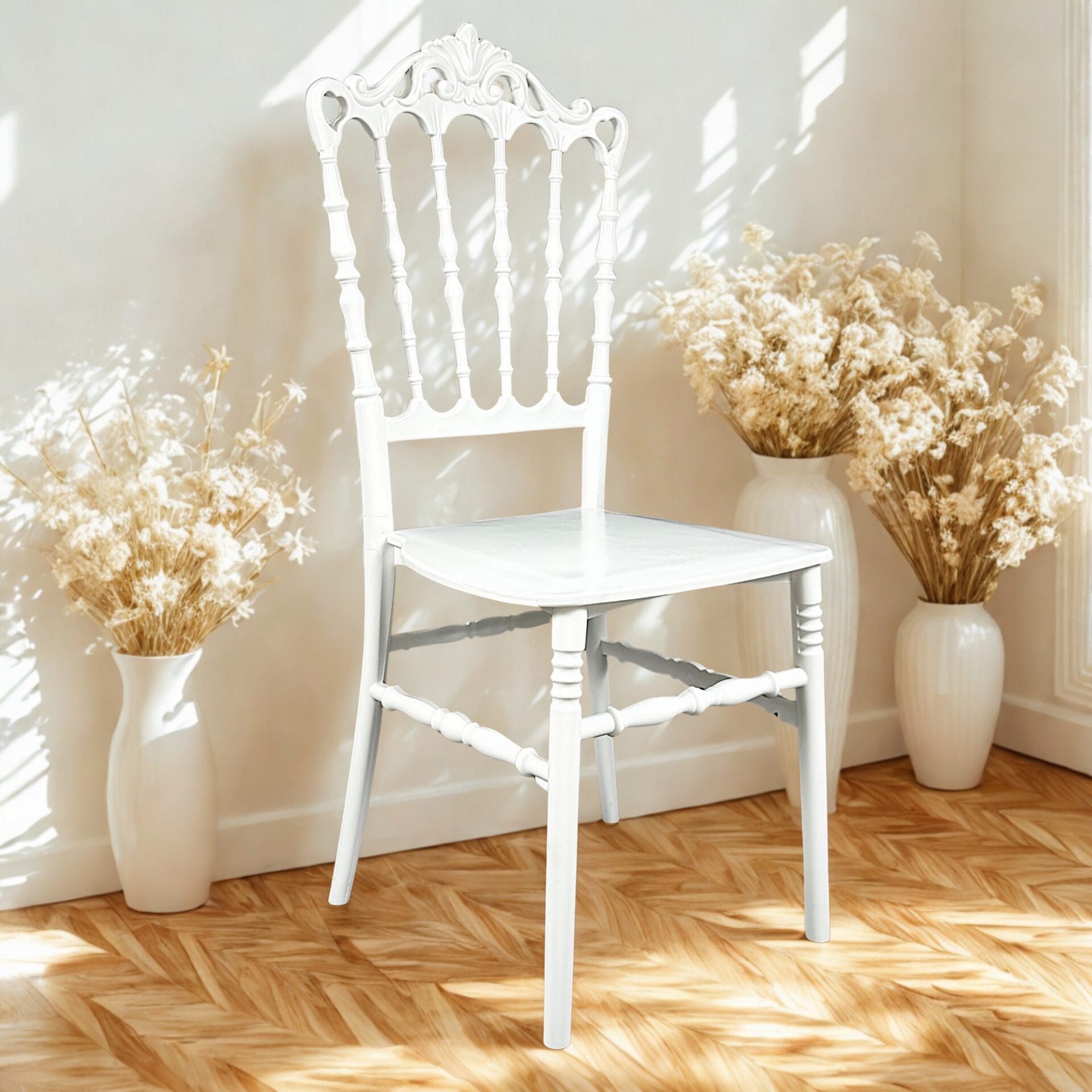 Etkinlikler için şık ve dayanıklı beyaz Napolyon sandalye modeli.